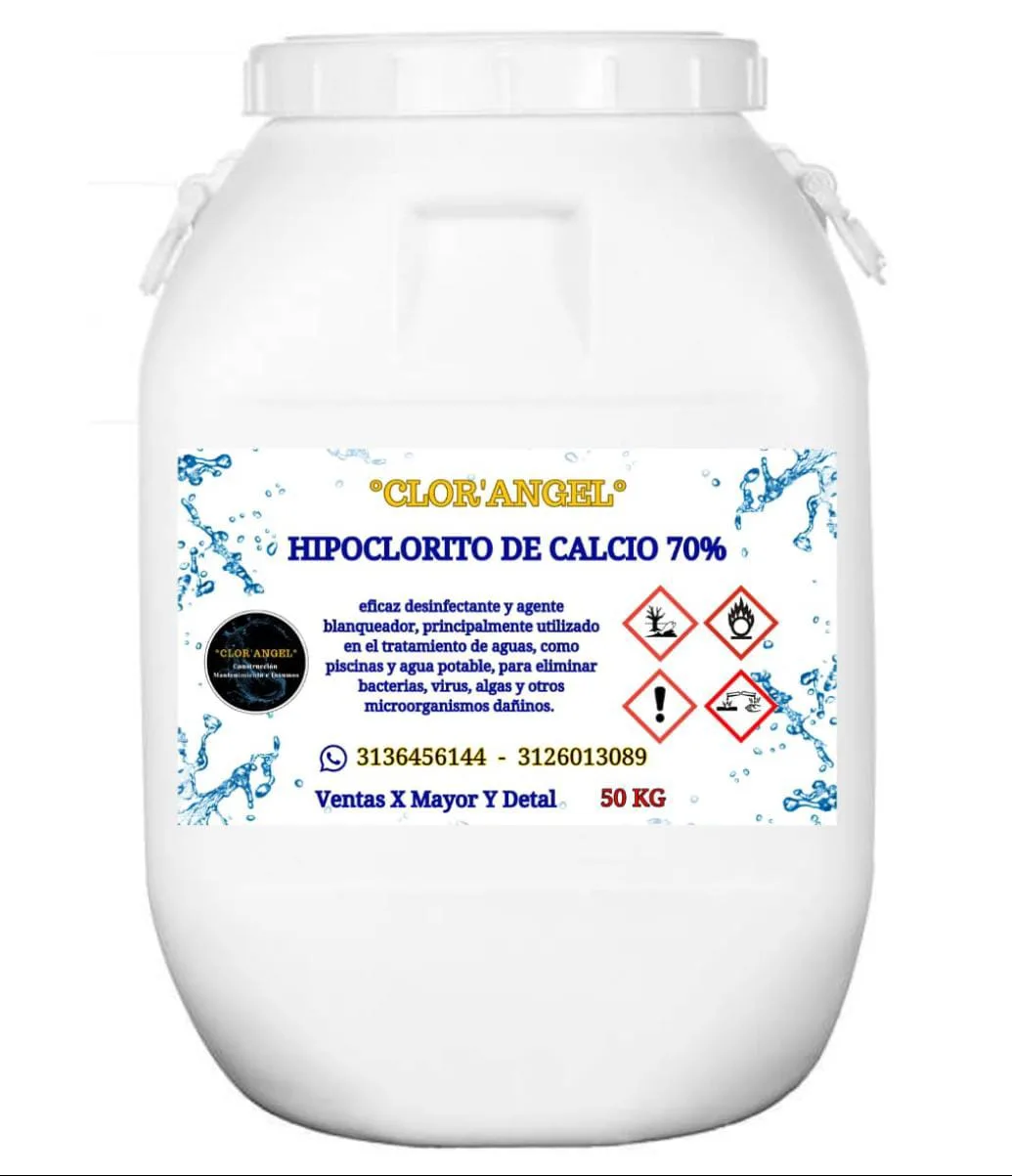Hipoclorito de calcio al 70% CLOR`ANGEL, potente desinfectante y agente blanqueador ideal para el tratamiento de aguas y piscinas. Elimina eficazmente bacterias, virus, algas y microorganismos, ayudando a mantener el agua segura, limpia y cristalina en aplicaciones residenciales y comerciales.
