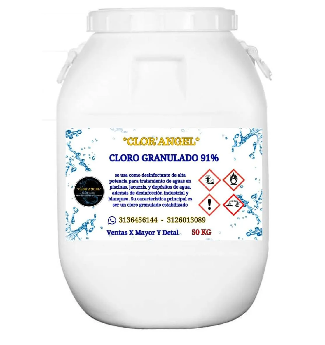 Cloro granulado al 91% CLOR`ANGEL, desinfectante de alta potencia para el tratamiento de aguas en piscinas, jacuzzis y depósitos. Proporciona una desinfección rápida y efectiva, eliminando bacterias, virus y algas, con un alto poder de estabilización para mantener el agua limpia, segura y cristalina en usos residenciales e industriales.